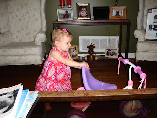 Our friends Kathleen and Chris brought us their girls' old Radio Flyer bike because they had outgrown it. Delaney LOVES it even though she can't reach the pedals yet.